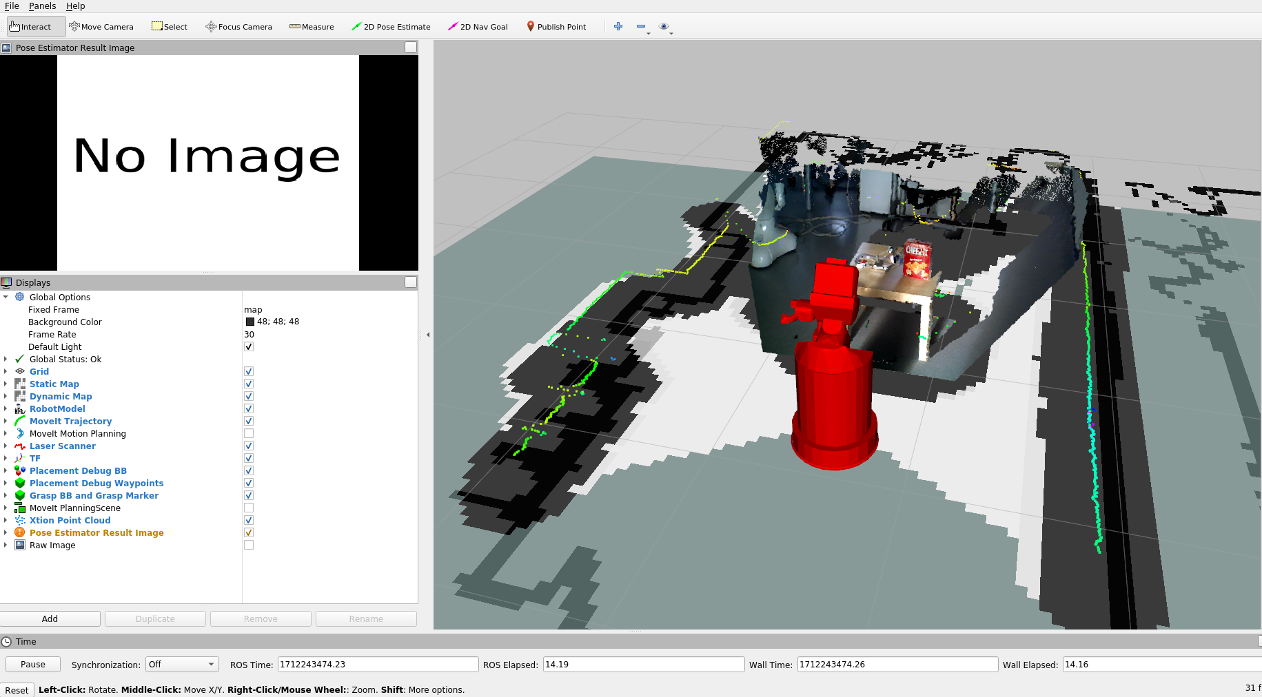 MoveIt Planning Scene: Visualizes the environment that is used for motion planning. It shows the robot, some manually added collision objects (e.g. the table), and an octomap that is created from the point cloud and laser data.